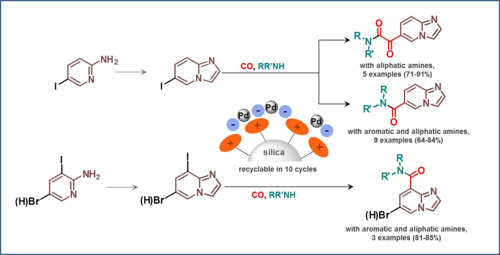 Synthesis of 6- or 8-Carboxamido Derivatives of Imidazo[1,2-a]pyridines via a Heterogeneous Catalytic Aminocarbonylation Reaction