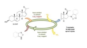 16α-Azolyl-pregnenolone derivatives were prepared via 2-butyl-1,1,3,3-tetramethylguanidine (n-Bu-TMG) catalysed aza-Michael addition of 16-dehydropregnenolone (16-DHP) carried out in [bmim][BF4]. The application of the guanidine base and the imidazolium ionic liquid made it possible to recycle not only the catalyst/solvent mixture but also the excess of the N-heterocyclic reagent. By the introduction of CO2 at the end of the reaction, both the guanidine base and the unreacted (excess) reagent could be converted into ionic species that remained dissolved in the ionic liquid phase, while the steroid components were extracted with an apolar solvent. After the removal of CO2, the experiment could be repeated by the addition of the steroid substrate and only an equimolar amount of the N-heterocycle. The methodology was successfully applied to a number of N-heterocycles, such as imidazole, pyrazole, 1,2,3- and 1,2,4-triazoles, and benzimidazole. Indazole and indole could also be converted into the corresponding products, but a stronger base had to be used to obtain a recyclable system.