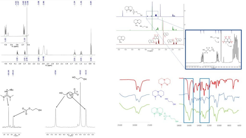 The structure of the new ionic liquids was determined. It was established by using IR and NMR measurements that only one of the hydroxyl groups of ethylene glycol was converted to carbonate when the base and alcohol were mixed in a 1/1 molar ratio. The reversibility of the ionic liquid was proved by conductivity measurements.