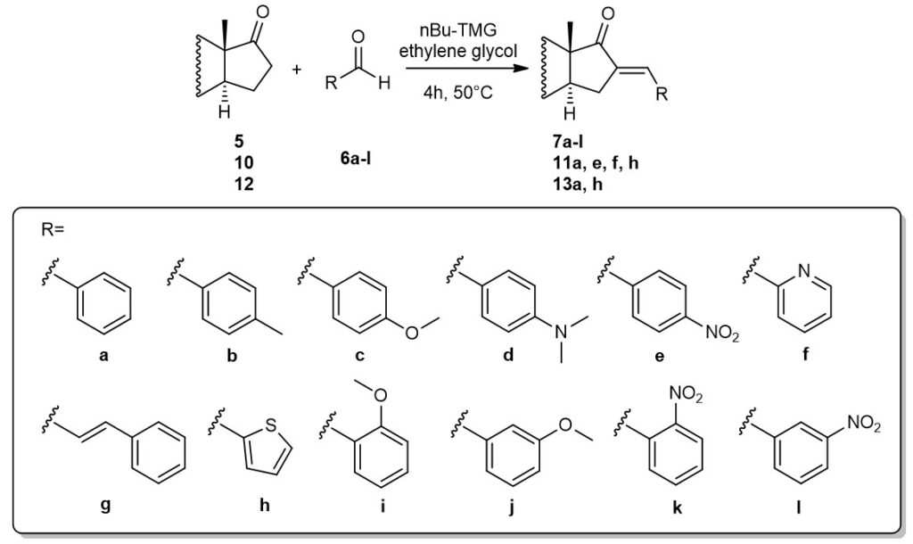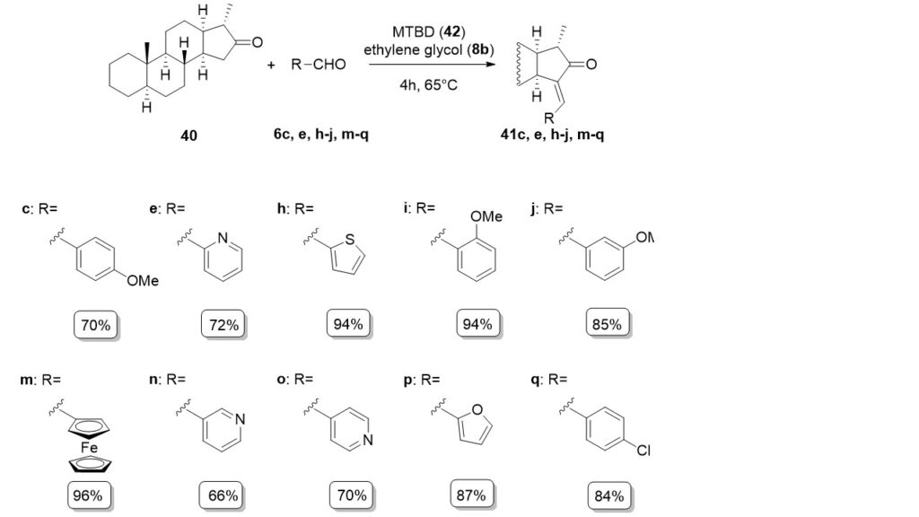 15-Arylidene steroids were obtained via the Claisen-Schmidt condensation between an unnatural 16-oxo-18-nor-5α-13α-steroid (40) and aromatic aldehydes in the presence of MTBD (7-methyl-1,5,7-triazabicyclo[4.4.0]dec-5-ene) (42) and ethylene glycol.