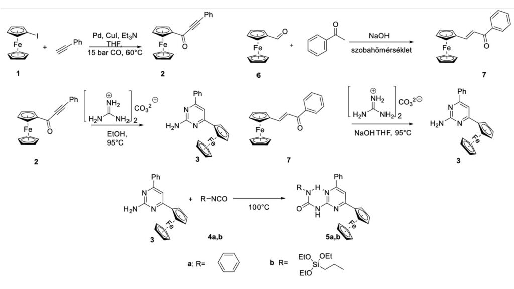 In addition to a previously know compound (5a), a new derivative (5b) was also synthesized by the new method. The palladium-caatalyzed carbonylative Sonogashira reaction, which was earlier used for the synthesis of the corresponding alkynyk ketone (2) intermediate was replaced by a cheaper andd less cumbersome aldol-type addition reaction to give an alkenyl ketone (7) with an analogous structure. During the preparation of 2-amino-6-phenyl-4-ferrocenylpyrimidine, the previously know procedure was modified by the addition of NaOH and the use of THF to avoid the formation of undesired by-products.