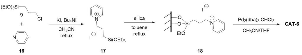 In order to improve the stability of the catalysts, three heterogeneous catalysts were prepared by using supports with grafted cations. Compared to imidazolium and phosphonium type SILPs, outstanding activity and selectivity as well as good recyclability could be achieved using SILP phases modified by pyridinium cations. Under optimised conditions CAT-6 provided minimal palladium leaching (0.2% in the first run and under 0.13% in further runs).