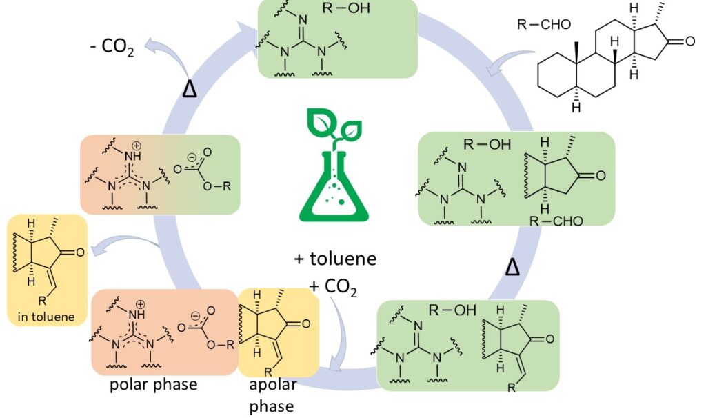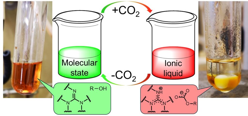 Reversivle ionic liquids (or switchable polarity solvens) are capable of changing their polarity reversibly between a nonionic and the ionic form in the presence of an external trigger (e.g. carbon dioxide). The base of this system are liquid bases (in our work a guanidine derivatives) and alcohols, which could be used as a catalyst and a solvent as well.