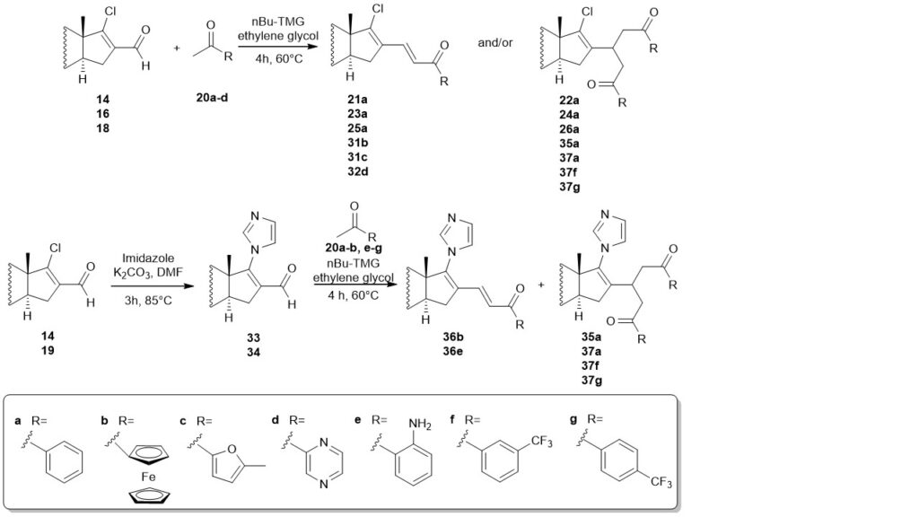 Different 17-chloro-16-formyl steroids (14, 16, 18) and 16-formyl-17-imidazolyl-steroids (33, 34) with androstane and estrone skeleton were synthesized and their Claisen-Schmidt condensation with aromatic ketones (20a-g) was performed. Among the 18 compounds synthesized, 14 steroids were new.