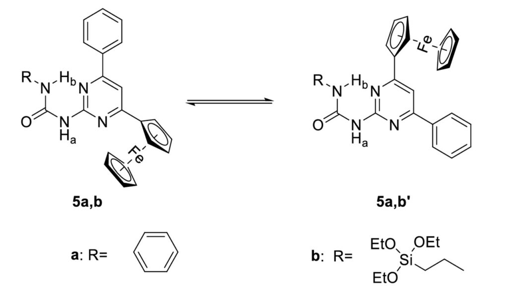 It was found, that the chloroform solution of 5a and 5b compounds contained two different ismoers (5a and 5a‘, as well as 5b and 5b’, similary to other 2-ureido-4-ferrocenyl pyrimidines, examined before). The activation parameters of the 5a-5a’ isomerisation reaction were determined by experimental, as well as by theoretical methods.