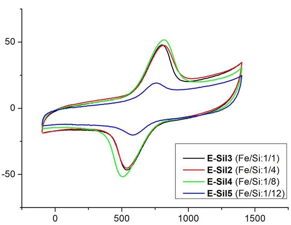 Sol-gel electrodeposition technique was used to obtain ferrocene-containing silica films on surface of spectral graphite electrodes. It was found that the reduction of the Fe/Si ratio led to the decrease of the functionalized silica film on the surface was proved by cyclic voltammetry experiments and SEM studies.