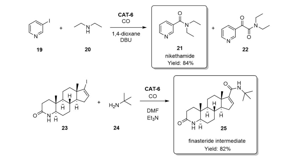CAT-6 catalyst was succesfully applied in the synthesis of two pharmacologically active derivatives. Excellent selectivity (over 95%) and yield (84%) were achieved in the sythesis of nikethamide. The finasteride intermediate was isolated in 82% yield. The CAT-6 catalyst proved to be reusable in five successive runs in both cases.