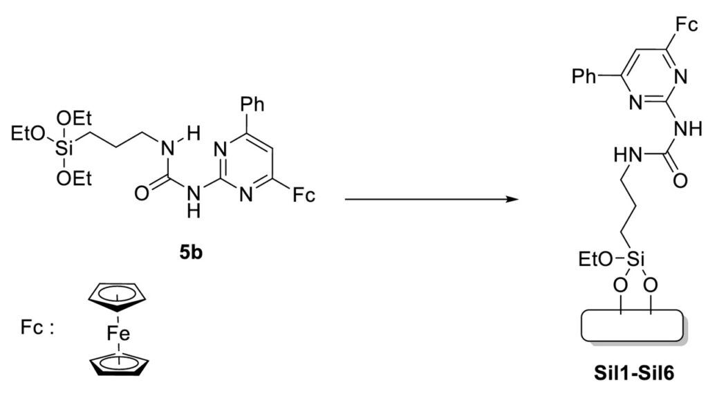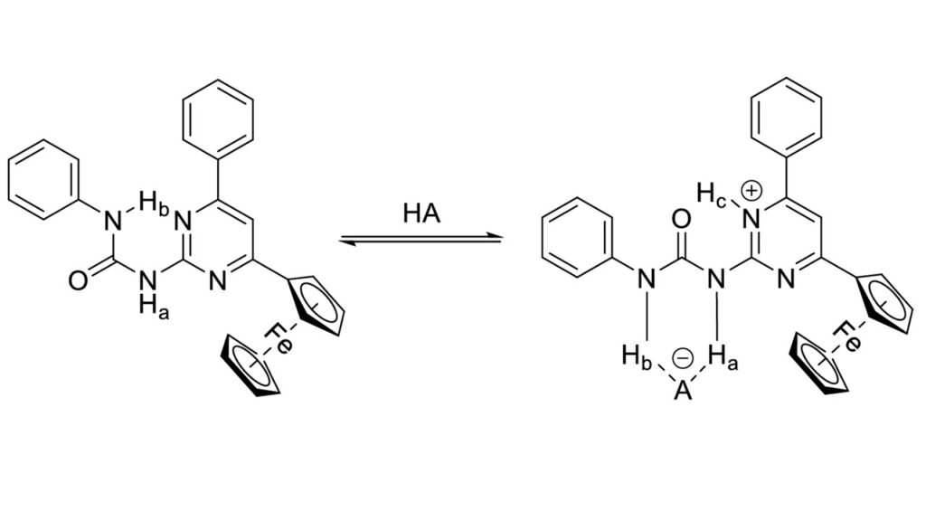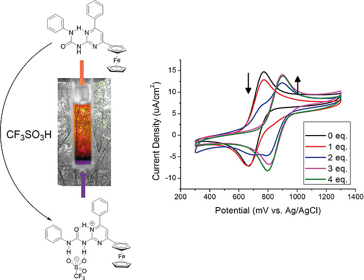 It was demonstrated that the changes detected in UV/Vis and 1H NMR spectra as well as in cyclic voltammograms in the presence of strong acids were results of the protonation and complexation reaction, involving 1-(6-phenyl-4-ferrocenylpyrimidin-2-yl)-3-phenylurea (5a). The molecule undergoes a structural change that allows the binding of anions of the strong acids applied. The structure of the complex formed by compound 5a with trifluoromethanesulfonic acid was also confirmed by X-ray diffraction.