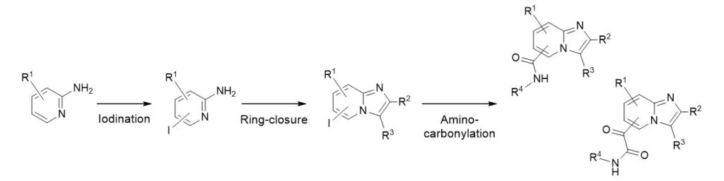 A three-step reaction route was developed to synthesize and functionalize different imidazo[1,2-a]pyridine derivatives.