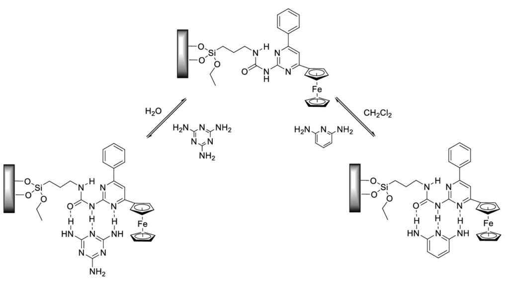 The numerous applications of ferrocene are due to the interesting chemical and electrochemical properties of the compound as well as its high stability. Its well-defined single-electron reversible oxidation reaction can be used to study various physical and chemical interactions, and its reactivity in electrophilic substitution reactions allows for several structural modification, making it an ideal sensing element for electrochemical sensors. Most of these sensors typically have a binding site that can selectively interact with the analyte to be tested and the resulting interaction can cause a change in the electrochemical behavior of the ferrocene incorporated into the molecule.