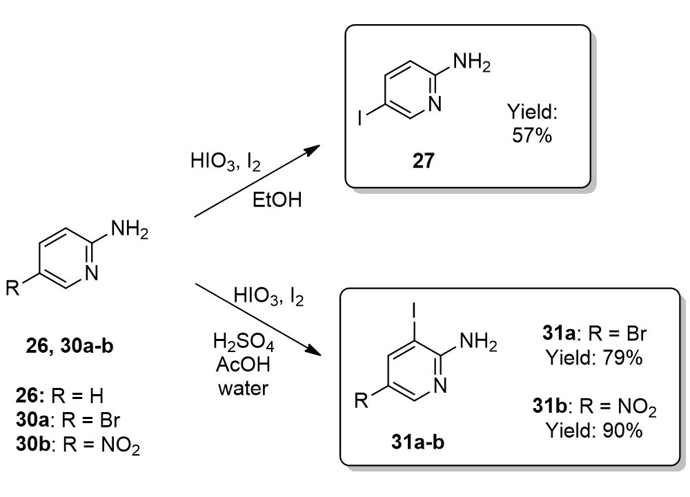 The iodination of 2-aminopyridine derivatives resulted in 2-amino-5-iodopyridine (27), 2-amino-5-bromo-3-iodopyridine (31a) and 2-amino-3-iodo-5-nitropyridine (31b).