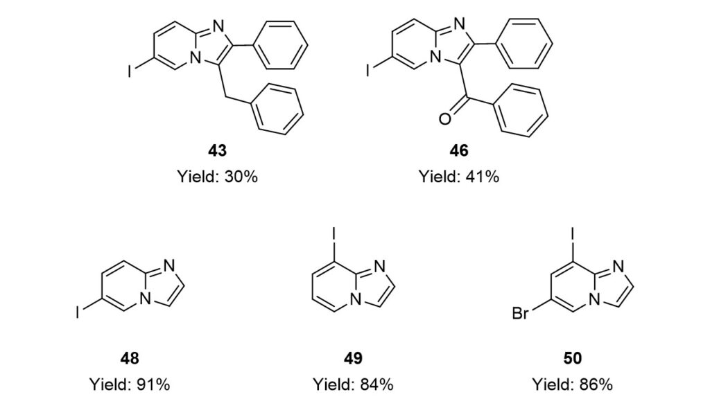 Seven methods were tested to form the imidazo[1,2-a]pyridine core. While the ring closure was easily accomplished under various conditions in the presence of 2-aminopyridines without the iodo substituent, the transformation of iodinated analogs proved to be more challenging. Utilizing the previously gained experience two iodoimidazo[1,2-a]pyridine derivatives (43, 46) were obtained in poor and three (48, 49, 50) in good yields.