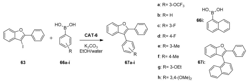 The heterogeneous catalyst (CAT-6) was suitable for the functionalization of 3-iodo-2-phenylbenzo[b]furan (63) in the presence of simple amines, acetylenes and boronic acids, in other words, in addition to aminocarbonylation the applicability of CAT-6 was proven in Suzuki- and Sonogashira coupling as well.