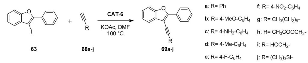 In the case of Sonogashira reaction the application of potassium acetate base and a temperature of 100 °C was found to lead to promising results. CAT-6 catalyst was tested both in the presence and in the absence of CuI cocatalyst. Although longer reaction time was required to achieve complete conversion under copper-free conditions, it was still more beneficial with respect to the stability, recyclability of the catalyst and palladium leaching (1-2%) indeed. Ten different 3-alkynylbenzo[b]furan derivatives were synthesized in Sonogashira reaction in 50-92% yields.