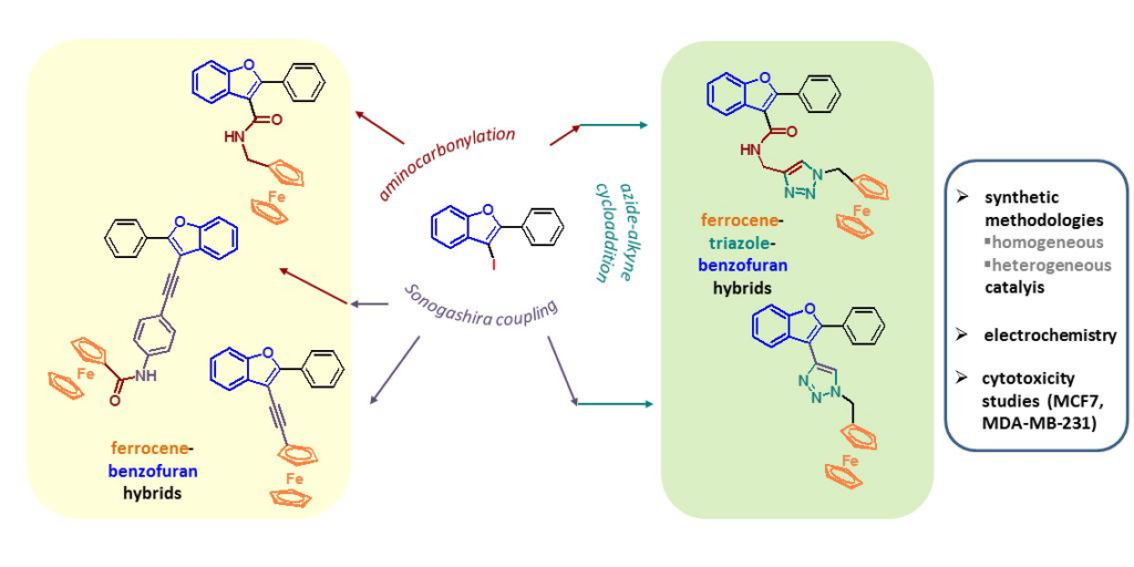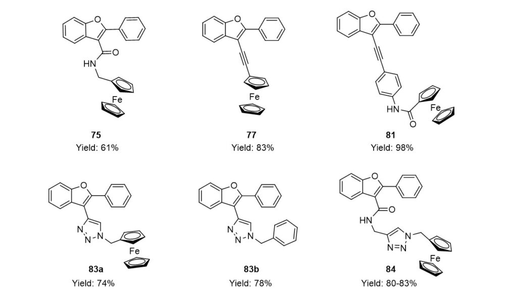 CAT-6 catalyst was found to be efficient in the synthesis of hybrid molecules as well. Three hybrids (75, 77, 81) were successfully prepared by the combination of benzo[b]furan core and ferrocenyl group. Palladium catalyzed reactions followed by azide-alkyne cycloaddition provided one triazole-benzo[b]furan (83b) and two ferrocene-triazole-benzo[b]furan hybrids (83a, 84). The toxicity of ferrocene-benzofuran derivatives on human breast cancer cell lines (MCF7, MDA-MB-231) were also studied. The results led to the conclusion that, in addition to the ferrocenyl group amide and triazolyl groups also play a significant role in the biological effect.