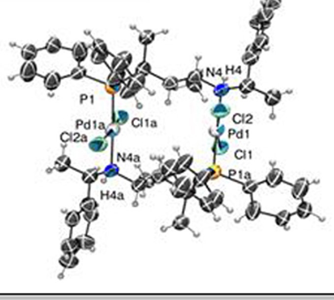 It was estabilished that [Pd(L)Cl2)complexes of pentane-2,4-diyl based ligands L1, L2, L3, L4 and L10 form six-member chelate rings with chair conformation. It has been recognized that the coordination of ligand L1 and L2 having sterically less demanding N-methyl and N-ethyl froup, respectively, results in the formation of an isomeric mixture. In constrast to these, the coordination of ligands L3, L9 and L10 with bulkier iPr-, Bz- and (S)-phenyl-ethyl substituents, respectively, occuors stereoselectively with respect to the configuration of the nitrogen and the conformation of the chelate ring. It has been proven that changing the length of alkane-diyl backbone also leads to the formation of ismoerically realted palladium species. In the case of ligand L13 with butane-2,3-diyl backbone the two five-membered chelates have opposite nitrogen configuration, the cooridnation of hexane-2,4-diyl based ligand L14 results in the formation od multiple complex species.