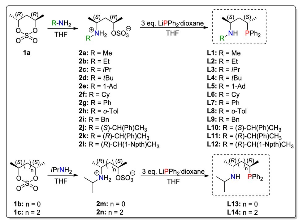 Ten novel (L2, L5-L8,L10-L14) aminoalkyl-phosphine (P,N) type ligans with stereogenic nitrogen was prepared. The synthesis of these compounds was carried out by a simple two-step method enables the preparation of versatile P,N type compounds, that differ in in the nitrogen substituens (L1-L12) and the lenght of P,N backbone (L13 and L14). The structure os the new compounds was investigated by nuclear magnetic resonance and mass spectroscopic methods.